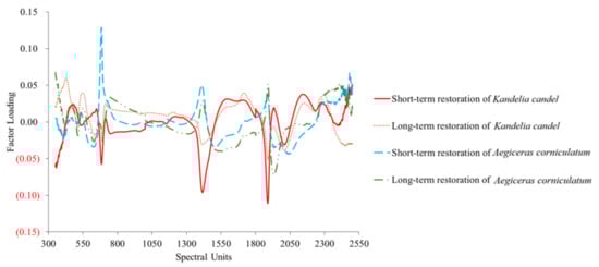 Spectral data were first differentiated and reciprocated and then were imported into GRAMS IQ software. Fourier transform, normalization, and multivariate scatter correction were performed on the data with the GRAMS IQ software. From 350 to 2500 nm, the leaves from the four different conditions, corresponding to 2151 spectral units of chlorophyll content, were subjected to factor loading analysis. In Figure 7, which shows the relationship between the spectral units that represented the chlorophyll content of mangrove leaves and the factor loading, we can see that correlations between the spectral representation of the chlorophyll content and the mangrove leaves were similar for the same species of leaf but contrasted for the different leaf species. The crests and troughs of the factor loadings for the mangrove leaves of the two species contrasted at spectral units of 700, 1400, and 1900 mm. This difference may be useful for classifying different mangrove species.
