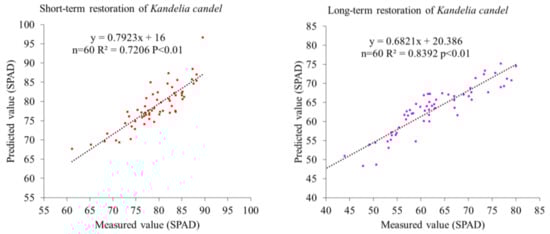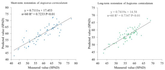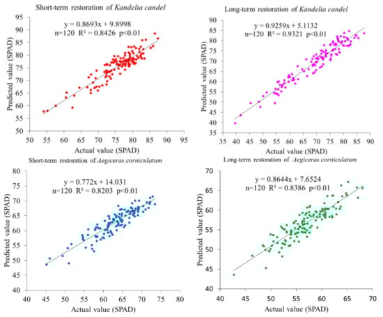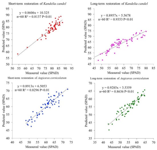 Sixty sets of sample data were used to validate the model. The R2 and the RMSE values calculated with the sample data indicated that the accuracy of the full-wave-band spectrum estimation model was high (Figure 9). The coefficients of determination and RMSEs from the regression model for Kandelia candel from short-term and long-term restoration were 0.8137 and 0.9353, and 2.47 and 2.26, respectively, while the coefficients of determination and RMSEs for Aegiceras corniculatum under short-term and long-term restoration were 0.8296 and 0.8636, and 2.52 and 2.01, respectively. The red-edge position model, with an R2 value greater than 0.7, was less accurate than the full-wave-band spectrum model (Figure 10).