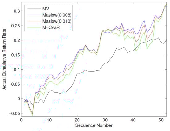 The cumulative return rates of the optimal portfolios got under different portfolio selection models. Note: MV, M-CVaR, Maslow (0.008) and Maslow (0.010) stand for the optimal portfolios obtained under the MV model, M-CVaR model, as well as our proposed model (13)–(21) with and , respectively.