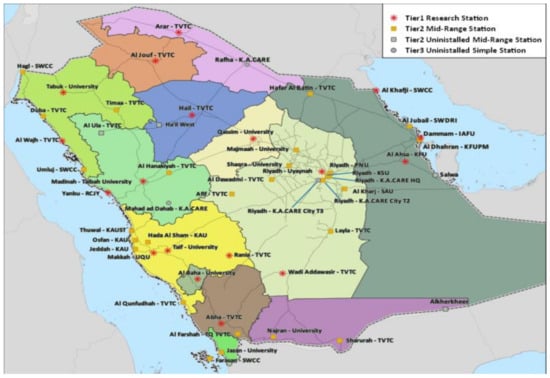 K.A.CARE has planned 53 SRMSs across the country, out of which 46 stations are already established in all provinces of Saudi Arabia. Distribution of these stations in various provinces is shown in the Map in Figure 1 [38]. Table 1 provides the detailed information about all 46 installed stations locations with station name, city name, province name, and station type. It can be observed in Figure 1 and Table 1 that the bulk of the stations are installed in the central region and western coastal areas. The northern part of the K.S.A has fewer SRMSs. There are only a few stations in the eastern part of the country. A summary of all existing and planned stations, their types, and installation status are shown in Table 2. It can be seen in Table 2 that no Tier 3 simple stations have been installed yet. There are 18 Tier 1 (research) stations with a low-level uncertainty of ±2% and 28 Tier 2 (mid-range) stations with medium level uncertainty of ±5% [38].