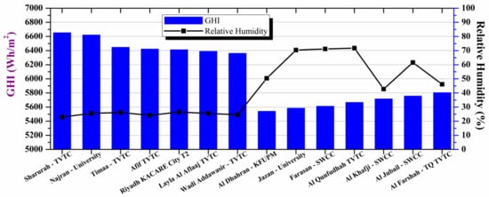 A plot of the average daily total GHI and relative humidity levels of the seven highest and seven lowest (GHI wise) stations is shown in Figure 2. Figure 2 clearly depicts that stations with low relative humidity have high daily average of GHI and vice versa. Six out of seven stations with low GHI are coastal area stations on both eastern and western coastal lines of Saudi Arabia. Eastern coastal area stations have relatively lower humidity level as compared to western coastal areas. Nevertheless, all the coastal area stations have relative humidity level of more than 50% except Alkhafji-SWCC station, which has a relative humidity level of 42.5%. Sea breeze brings a lot of moisture resulting in increased level of relative humidity. The relatively low level of humidity is due to wind direction and speed at Alkhafji. Wind speed at Alkhafji-SWCC station is 3.1 m/s and average wind direction is 236° (SW) as compared to Jubail-SWCC station with an average wind speed and wind direction of 3.6 m/s and 258° (WSW), respectively. Cross-wind at Jubail-SWCC brings lot of moisture from sea as compared to Alkhafji-SWCC station with lesser wind speed and different wind direction angle. This has resulted in lower relative humidity level at Alkhafji-SWCC as compared to Jubail station. None of the seven top-ranked stations are located in coastal areas. In fact, all of them are located in the dry areas with very low relative humidity levels of under or around 25%. A high level of relative humidity not only affects the GHI but it also affects solar PV modules and their efficiency as well. Although water vapors in the atmosphere are not visible to human eye, yet they are visible to solar cells. Corrosion is one of the major effects of humidity on solar cell and it becomes a grave issue if temperature is also high at the same time. In humid weather, the corrosion phenomenon may deteriorate the titanium–silver contact on silicon solar cells. High temperatures in the range of 40 °C–60 °C may result in long-term deterioration of these contacts [39]. Typically, the corrosion process accelerates under high humidity and high temperature conditions because of the presence of minute quantities of ionization contaminate (e.g., salts). Another effect of higher humidity is growth of fungus. High humidity levels around 75% to 95% and temperatures in the range of 20–40 °C result in higher growth rate of fungi [39]. Other effects include the formation of a sticky surface film of moisture that catches dust and dirt particles.