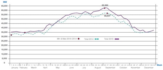 A very important angle of analyzing GHI values is to match the pattern of GHI over the period of one year with annual load curve of the country. It is very important that solar radiation patterns follow the load curve. If high solar radiation is available during those months of the year when the load of the country is high, then this high radiation can really help to cut the peak of the load curve by the inclusion of solar PV power in the system. Figure 3 shows the annual load curve of Saudi Arabia for two consecutive years 2014 and 2015 [42]. It can be seen in the load curve that the load is high during summer from the month of April to October. The load is almost double during summer months.