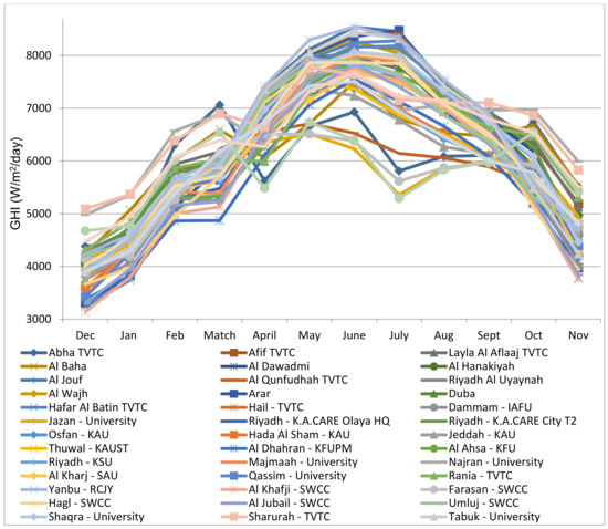 One-year data for 46 installed stations was collected from K.A.CARE. Data from 44 stations is complete for the one-year study period from December 2015 to November 2016. Two stations have incomplete or no data. Princess Noora University Riyadh station has no data for the given period and Taif University station has one month of missing data (November 2016). GHI data for all the 44 stations is presented in Table 3. We analyzed the data in Table 3 to know the station wise pattern and trends of GHI in each region. It can be observed in Table 3 that a minimum average daily total GHI of 5542.6 Wh/m2 is at Al Dhahran station, which is a Tier 2 station. Al Dhahran is a coastal area station in the eastern province with high water vapor and more cloudy weather, which is one of the factors to lower the level of GHI in this area. Jazan University station has the second lowest average daily total GHI during the study period followed by Farasan Island station at third lowest. Both of these stations are also coastal area stations in Jazan province in the western region of Saudi Arabia. Al Qunfudhah TVTC, again a coastal area station in Province of Makkah in the western region of K.S.A, has the fourth lowest average daily total GHI. AlKhafji—SWCC and Al Jubail—SWCC stations are placed in the fifth and sixth lowest positions. Both AlKhafji—SWCC and Al Jubail—SWCC stations are also coastal area stations situated in the coastal area of the eastern province. Here, the trend shows that coastal area stations on both eastern and western regions of Saudi Arabia have lower levels of GHI, which is linked to cloudy and humid weather of these areas.