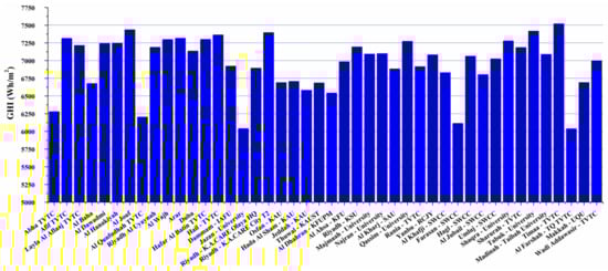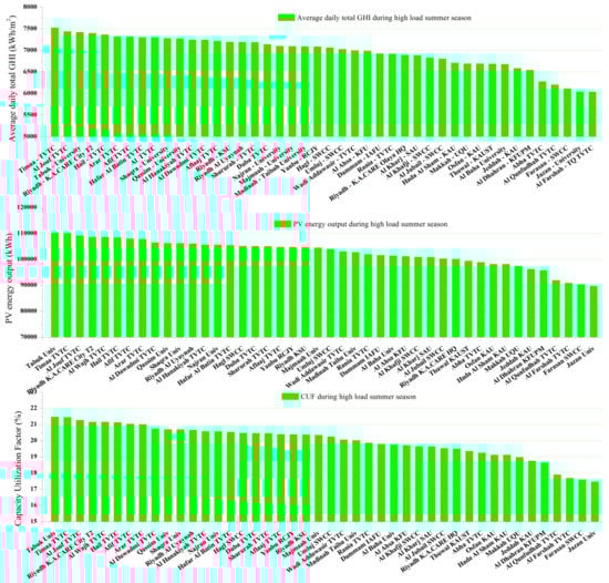 A comparison of the top 10 stations with respect to GHI and top 10 stations with respect to PV energy output, and shift in the position of stations over the period of one year and during the high load summer season is presented in Table 7. It is clear that high average daily total GHI is not a sufficient criterion to find the best location for a PV plant because there are other factors which affect the PV energy output as well. The magnitude of the impact of other factors could be different under different weather conditions in different countries. As the K.S.A has hot weather, impact of temperature on PV energy output is greater.