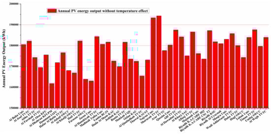 Figure 6 shows the PV output of 100 kW solar power plant without considering the effect of temperature. The K.S.A is a country with very hot and long summer season. The temperature in some areas reaches 50 °C during summer season. It can be observed in Equation (1) that PV output decreases linearly with increasing temperature, therefore, it is very important to consider the effect of temperature while finding the most feasible sites for solar PV generation. Table 6 shows the average monthly daytime temperatures of 44 locations under study [38].