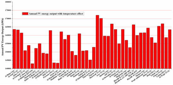 Figure 7 shows the total annual electrical energy output of the proposed 100 kW solar PV plant by taking into account the effect of temperature on PV output at 44 locations across the Kingdom. It is observed that Najran University station gives the highest annual electrical output of 172,083 kWh followed by Sharurah TVTC station with 170,184 kWh output energy. It was the other way around when temperature effect was not included in the analysis. The reason behind the shift in top-ranked stations is the higher temperature in Sharurah and moderate temperature in Najran during the summer season. The average daytime temperature of Sharurah over one year study period is 31.3 °C and average daytime temperature at Najran is 28.4 °C. Timaa TVTC is the third best with 166,957 kWh output. It can be observed by comparing energy production of the proposed PV plant in two cases (with and without temperature effect) in Figure 6 and Figure 7 that if we consider the temperature effect, then ranking of most feasible stations may change. A particular station might have a good solar GHI but at the same time temperature at that site could be on the higher side and it will cause a reduction in the total annual output energy at that site. As Saudi Arabia is a hot country with very high temperature in the long summer season, so temperature plays a vital role in the selection of feasible PV sites.