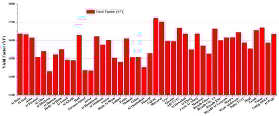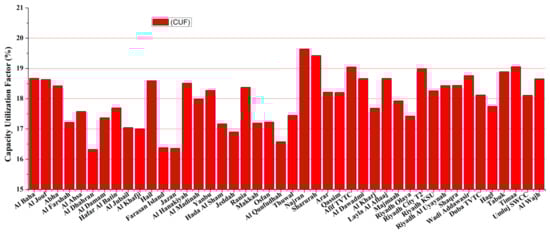 Figure 8 shows the yield factor (YF) of the proposed PV system at 44 locations. Figure 8 indicates that Najran University station has the highest YF of 1721 followed by Sharurah TVTC station with a YF of 1701.8 and the lowest YF is observed in Al Dhahran station which is 1429.9. Figure 9 shows the capacity utilization factor (CUF) of the proposed PV system at 44 locations, which is the measure of percentage usability of the PV system. Najran University station has the highest CUF of 19.6% followed by Sharurah TVTC station with 19.4%, and the lowest CUF is observed in Al Dhahran station, which is 16.3%.