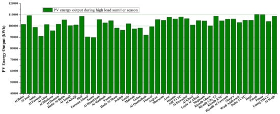 Figure 10 shows the energy output of the proposed PV plant at 44 locations during the high load summer months including the temperature effect. It can be observed in Figure 10 that Tabuk University station has the highest annual energy output of 110,250 kWh for the proposed 100 kW PV system during high load season and Timaa TVTC is at the second place with 110,148 kWh. Although Timaa TVTC has better GHI in the high load summer season as compared to Tabuk University station, but the high temperature at this location has pushed it down in the ranking. The average daytime temperature at Tabuk in high load summer season (April to October) is 30.8 °C and at Timaa is 33.1 °C. Al Jouf TVTC and Riyadh K.A.CARE City T2 are the next two in the list with 109,235 kWh and 108,647 kWh respectively.