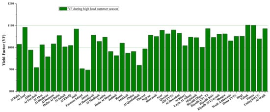 Yield factor (YF) of the proposed PV system at 44 locations during high load summer season.
