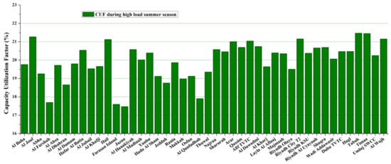Capacity utilization factor (CUF) of the proposed PV system at 44 locations during high load summer season.