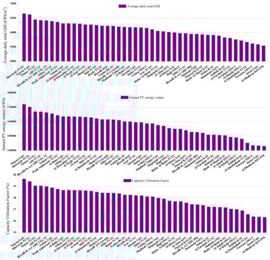 Ranking of stations based on average daily total GHI, annual PV energy output, and capacity utilization factor.
