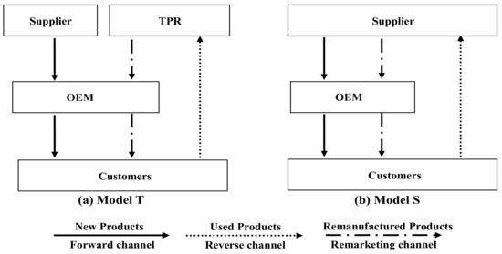 Lacking the advantages of collecting used cores [4], most OEMs, especially those in developed countries such as the United States, European countries, and Japan, prefer to outsource remanufacturing operations to other agents [7,8]. For example, Land Rover formed a strategic alliance with Caterpillar Remanufacturing Services, in which Land Rover outsourced its remanufacturing operations to the latter [9]. It should be noted that since the third-party remanufacturer (TPR) is an independent member that maximizes profits from remanufacturing only, the potential for cannibalization of new products becomes a concern when OEMs outsource their remanufacturing to TPRs [10,11]. As a result, in recent years, many brand-name OEMs have outsourced remanufacturing operations to suppliers that have a common interest in embracing profits from new products. For example, Apple signed a Memorandum of Understanding in which Foxconn, the largest supplier of Apple’s portable and desktop products, would offer remanufacturing services for iPhone mobile phones in the Chinese market [12]. A similar case appeared in the automobile industry: In 2008, the China National Development and Reform Commission launched a pilot program for automobile parts remanufacturing, in which half of the assigned firms are automobile parts suppliers [13].