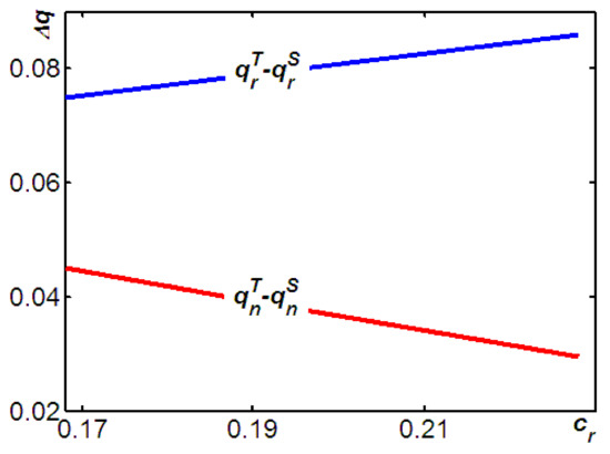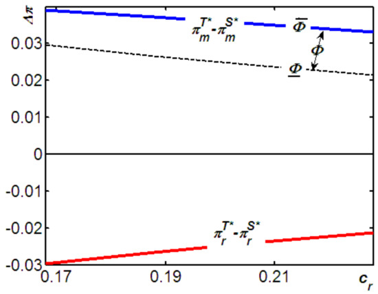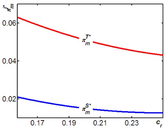 Figure 5 illustrates three phenomena. First, we observe that, as Proposition 6 shows, although the supplier provides more quantities of new products in Model T (i.e., ), the remanufacturer in Model T would remanufacture even more units than in Model S (i.e., ). Second, intuitively, the level of remanufacturing in Model T and Model S are both decreased with the cost of remanufacturing. However, Figure 6 shows that, the level of increases with the cost of remanufacturing. Meaning that, the impact of rising remanufacturing costs on the level of remanufacturing in Model S is heavier than that in Model T. That is, as the cost of remanufacturing increases, the decreasing level of remanufacturing in Model S is faster than that in Model T. Third, Figure 5 shows that, the level of decreases with the cost of remanufacturing. This reflects the fact that, as the cost of remanufacturing increases, the OEM has a higher incentive to increase the new products availability in Model S than in Model T. As a result, as the cost of remanufacturing increases, the difference of the availability of new products in both models, i.e., decreases. Figure 5 illustrates these findings.