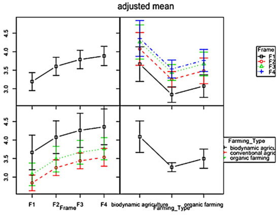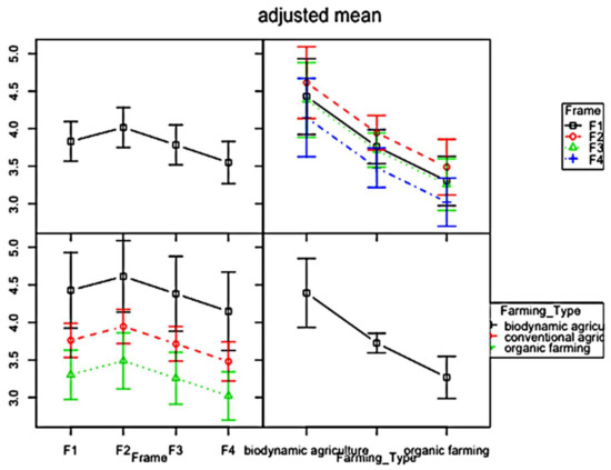 Respondents’ reactions to two statements are discussed here to account for two of 16 facets of risk and coping appraisal: (1) “Climate change is a serious risk to me” to account for risk perception; and (2) “My farming is adapted to climate change” to reflect on respondents’ self-efficacy. We have chosen to discuss those two as they show the most pronounced results (cf. Appendix for an overview on effects on all variables in Table A1). Previous experience with an extreme event has a demonstrated effect on the treatment group’s assessment of the degree to which they consider climate change a risk and how they assess their ability to cope with climate change. Furthermore, the framing effect differed in relation to the type of farm. Biodynamic and organic farmers, for example, show higher degrees of agreement towards the statement. Heterogeneity in the data is a result of the differences across sub-groups and can be explained by varying degree of adaptive capacity according to farming types. As the interaction of means shows, different farming types result in different effects.