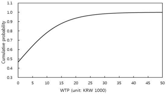 Table 2 presents the estimation results of the model. The estimates for and are all statistically significant. In particular, the negative sign of the estimate for indicates that higher bid amount induces lower likelihood of saying “yes” to a presented bid. From Equation (1), the spike is derived as . The estimate for the spike is calculated as 0.4714 and statistically significant. Because the spike implies the possibility of the interviewee’s having zero WTP, the estimated spike should not be significantly different from the sample ratio of zero WTP (46.5%). This is the case with our study.