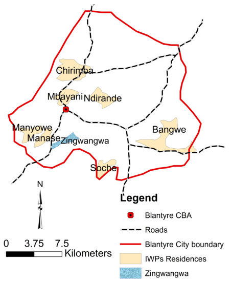 The research was conducted in the Zingwangwa Township in Blantyre, Malawi. Zingwangwa is a largely unplanned settlement area in the south of Blantyre. Zingwangwa is unique because, not only is there a large number of IWPs operating in the area, but because it is surrounded by high and medium income settlements where IWPs also recover materials. Figure 1 is map of Blantyre showing the location of Zingwangwa.
