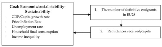 This research has the purpose to contribute to a field less studied: investigation of the determining factors of the migration process, and impact of international migrants’ remittances on the sustainable economic and social development of Romania and Bulgaria, countries geographically placed in Central and Eastern Europe. According to Daianu et al. [24], Romania and Bulgaria are among the countries with a relatively high dependence on remittances, offering security especially to poor and unemployed people, contributing to the increase of wealth and of national income, to import financing and to the decrease of current account deficit. In agreement with Haller [25,26], we make the distinction between sustainable economic development and sustainable social development, that is, the economic one is synonymous to growth, representing an increase of macro-indicators. When growth (economic development) influences a society by the increase of wealth, we are speaking about sustainable social development. Not any economic progress is positively influencing the society, therefore it is necessary to make the distinction between the two concepts, one quantitative and the other qualitative.