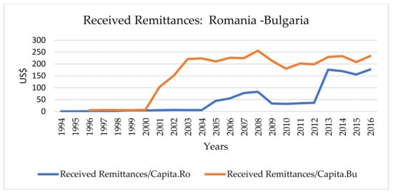 However, we noticed that after 2000 and 2007, the volume of remittances has increased surprisingly for both countries. During 2000–2004, the increase of remittances was significant in the case of Romania. It was only after 2004 that the volume of remittances reached an ascending trend in the case of Bulgaria, lower than in Romania. The graph shows two inflexion points for both countries. One is characterising the adherence to the EU which offered the possibility of people’s free circulation on the EU territory and the other shows the years of peak crisis which acutely influenced the Romanian and Bulgarian economy and society, respectively. A more detailed analysis of the evolution of Romania and Bulgaria remittances based on Figure 3 was performed in Section 2.3 of the paper.