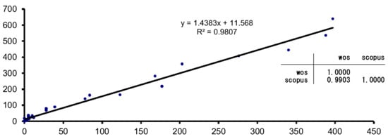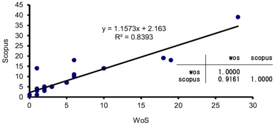 Correlation between the numbers of articles published in WoS and Scopus. Source: Own elaboration.