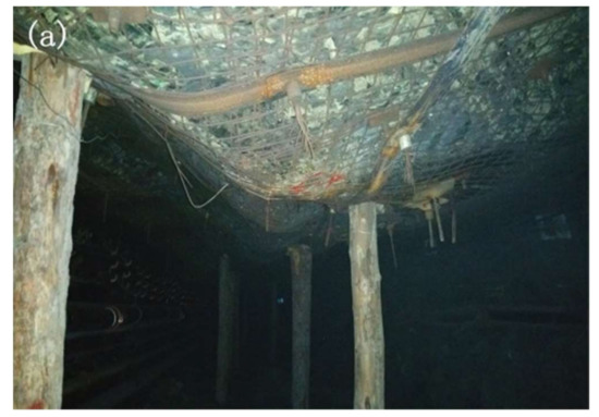 Deformation of roadway after mining: (a) deformation of the roof of the roadway; (b) roof failure. Notes: Roof deformed by up to 900 mm, and fissures extended to a depth of about 4.8 m from the roof surface.