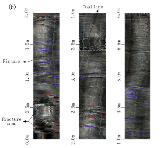 Borehole images of the roof during: (a) excavation, (b) mining. Note: Blue lines indicate the locations of fissures, red ellipses indicate fracture zones, and white rectangles mark coal lines.