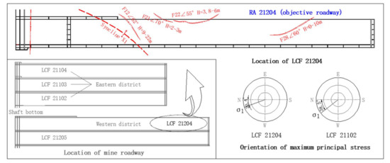 - Li, H.; Lin, B.; Hong, Y.; Gao, Y.; Yang, W.; Liu, T. Effects of in-situ stress on the stability of a roadway excavated through a coal seam. Int. J. Min. Sci. Technol. 2017, 27, 917–927. [Google Scholar] [CrossRef]