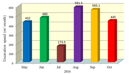 Return airway (RA) 21204 has been selected as the object of this study. It is 5851.7 m long and runs parallel to auxiliary return airway (ARA) 21204. The excavation of ARA 21204 was stopped after 1228 m. The average excavation speed of RA 21204 is 448 m/month (Figure 4), which is insufficient to meet production needs.