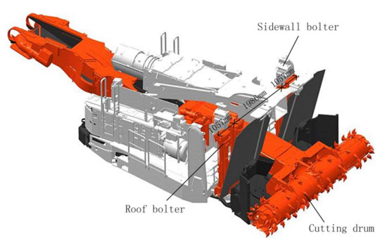 - Simultaneous excavation and bolt installation. In RA 21204, excavation and bolt installation are carried out using the MB670 bolter miner, which is manufactured by Sandvik Mining and Construction G.m.b.H (Figure 6). When the bolter miner cuts coal, bolts can be installed simultaneously by the roof bolter and the sidewall bolter, preventing initial deformation of the roadway and failure of rock mass. This can maintain the integrity of the rock mass in the roof and improve excavation speed.
