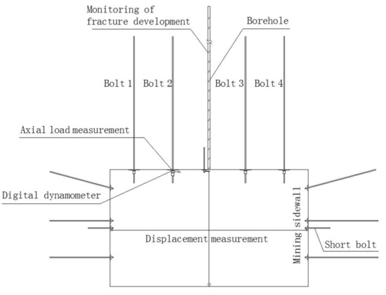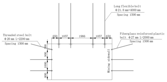 - The sidewall that was mined was supported with fiberglass-reinforced plastic bolts, each 27 mm in diameter and 2000 mm in length, combined with a plastic mesh that was 5400 mm long and 3200 mm wide. The pretensioned torque was 100 N·m or above. The other sidewall was reinforced by threaded steel bolts, each 20 mm in diameter and 2200 mm in length, combined with a diamond-shaped metal mesh that was 5400 mm long and 3200 mm wide. The corresponding torque was greater than 150 N·m.