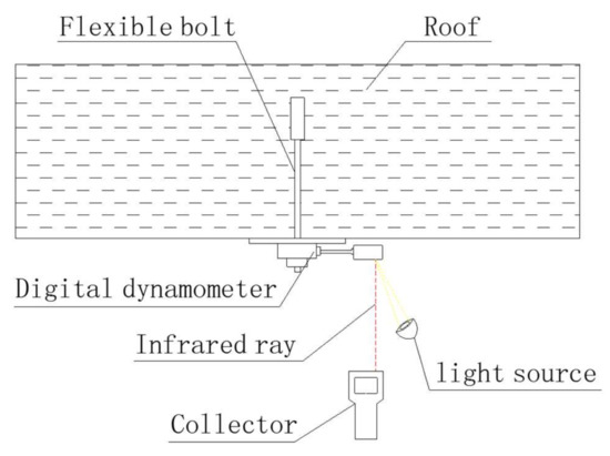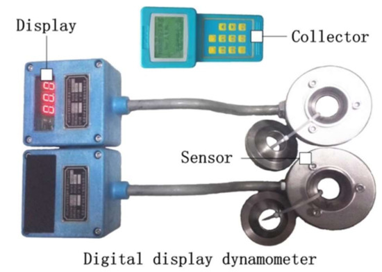 The axial load on flexible bolts was monitored in real-time using the MCS-400 digital dynamometer, which can measure up to 400 kN (Figure 8). This is a vital part of routine monitoring of the roadway reinforcement system and provides information on the working conditions of the bolts. The working principle of the digital dynamometer is shown in Figure 9. The dynamometer consists mainly of sensors, transmitters, and displays. The axial load on bolts causes the sensors to deform. The sensors transform the deformation into a voltage signal, which is converted to a pressure value and displayed on the screen. The internal sensor can save the data every two hours. The collector can download the data when its infrared acquisition port is aligned with the dynamometer window under the light of the miner’s lamp.
