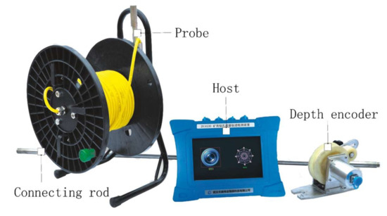 Fracture development in the surrounding rock was monitored using a ZKXG30 borehole scanner. The scanner is mainly composed of a computer host, a probe, and a depth encoder (Figure 11). A borehole 10 m in length was drilled into the roof. The probe was inserted into the hole using the connecting rod. The probe has a camera and a three-dimensional high-performance electronic compass that records the azimuthal and dip angle of the borehole. The probe transmits its signals to the host computer via the cable. The host calculates the depth of the probe using signals from the probe and the depth encoder. Video signals are processed. Images are recorded, matched, and spliced, producing panoramic images of the borehole wall.