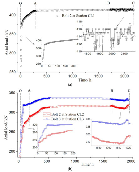 The overall features of the evolution of axial loads on Bolt 2 at Station CL2 and Bolt 3 at Station CL3 are consistent with those at CL1 (Figure 14a,b). Figure 14b shows that loads on Bolts 2 and 3 increased sharply over the first 50 h. Loads on Bolt 3 remained stable at 322 kN from the 50th to the 160th hour, while loads on Bolt 2 increased gently over the same period. Table 5 shows that increased loads due to excavation operations were measured up to 157.5 m behind the excavation face, and that the area within the first 56.5 m was severely disturbed by excavation. During stage AB, the evolution of axial loads at CL2 and CL3 was different from that at CL1. Loads on Bolts 2 and 3 increased gradually between the 220th and the 340th hours because of disturbances from the preparation of the working face. Loads stabilized after this period. During stage AB, loads dropped slowly, followed by a rapid rise. Disturbances from excavation were measured over a larger area at Stations CL2 and CL3 than at CL1 because of differences in geological conditions at the stations.