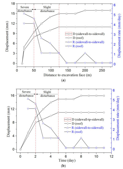 Surface displacement of RA 21204 during excavation: (a) Displacement versus distance; (b) Displacement versus time.
