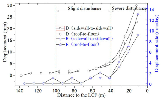 Displacement and the displacement rate experienced an overall upward trend as the working face approached the monitoring stations (Figure 17). Mining of LCF 21204 had a greater impact on the roof and floor than on the sidewalls. For instance, at a distance of 40 m from LCF 21204, roof-to-floor displacement increased from 6 to 30 mm while sidewall-to-sidewall displacement only increased from 5 to 23 mm. Roof-to-floor and sidewall-to-sidewall displacement rates suddenly increased to 9 and 13 mm/day, respectively. The area within 40 m from the excavation face was the most severely disturbed, with slight disturbances extending across an area of up to 100 m from the excavation face. Deformation characteristics during mining were considerably different from those observed during excavation.