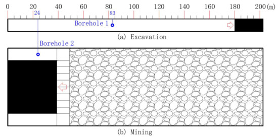 Locations of the boreholes used for monitoring fracture development in the roof: (a) Images from borehole 1 were taken at 97 m behind the excavation face; (b) Images from borehole 2 were taken at 25 m ahead of the LCF in the area of strong disturbance.