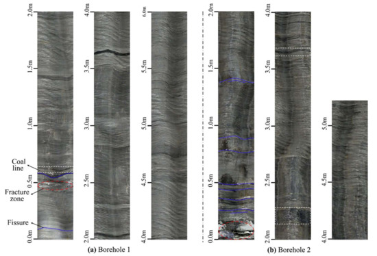 Borehole 1 was used to monitor fracture development during excavation (Figure 20a). Two fissures were observed at 0.15 and 0.6 m from the roof surface, and one fracture zone was recorded at 0.4 to 0.5 m from the roof surface (Figure 20a). In addition, two ultra-thin coal seams were found at 2.0 and 3.6 m from the roof surface. Fractures mainly occurred in the area close to the roof surface, and did not extend into the deep rock strata.