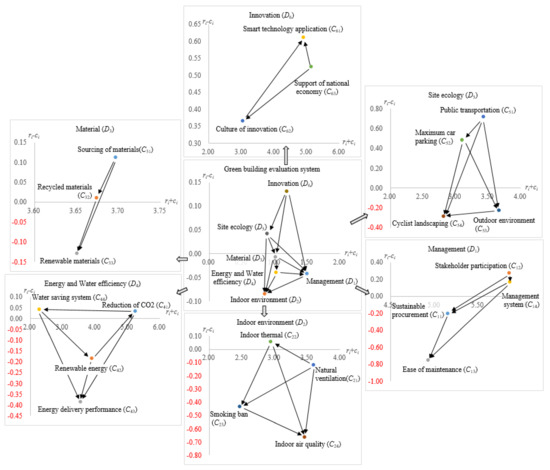 As we can see in Table A4, the largest (ri – ci) value (0.13) is for innovation (D6), so this is the most influential dimension. It means that innovation is the key to the development of a green building. Furthermore, innovation technology will have a deep influence on the other dimensions. In addition, management (D1) has the maximum value (ri + ci) (1.49), which means that it has the largest total influence degree within dimensions. As we know, green building operation, use of sustainable materials, improving energy efficiency, water saving, indoor environment and so on are also closely related to management in China. Therefore, management affects the other dimensions, like indoor environment, material, energy and water efficiency and site ecology, and it is also affected by innovation. The influence value, which is greater than the average of all criteria in the total influence matrix (0.09) is set as the threshold to determine the directions of influence between dimensions and criteria. As we can see in Figure 1, the influence network-relationship map (INRM) of the six dimensions and their subsystems can be plotted according to Table A2 and Table A4.