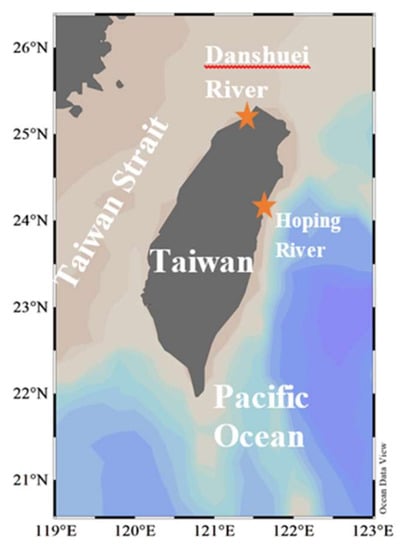 The study area. Orange stars represent the location of the Danshuei River mouth and the Hoping River mouth in Taiwan.