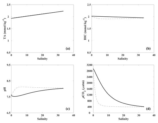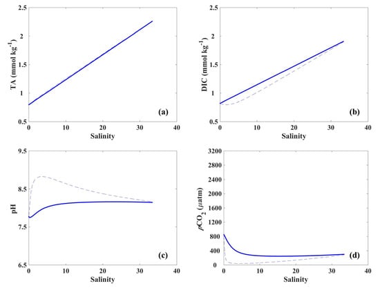 In the conservative mixing scenario, the model result displayed conservative mixing for both TA and DIC along the salinity gradient in the Danshuei estuary, as we have set (Figure 2a,b). The variations of pH and pCO2 values along the salinity gradient were nonlinear. The pH value showed a minimum value at salinities 1 to 2 and varied over a larger range in low salinities. The opposite was true in high salinities. The variation of pCO2 was bimodal, displaying high values to both riverine and sea end-members. For the biological uptake scenario, TA slightly changed and maximum DIC changed at middle salinities, corresponding to the maximum NO3 uptake. The pH and pCO2 values showed clear differences between conservative mixing and biological uptake scenarios (Figure 2c,d); that is, pH values increased and pCO2 decreased after biological uptake.