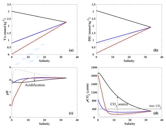 The impact of controlled pH and pCO2 waters on the TA, DIC, pH and pCO2 in the study region. The conditions of conservative mixing (blue lines) and biological uptake scenarios (dash lines) in the Danshuei River (Figure 2) are repeated here for comparison. We simulated the injected DIC solution in two conditions: (1) water with a pH of 6 and a pCO2 of 2000 µatm (red lines) (c,d), leading to low TA, DIC values at salinity 0 (a,b); and (2) water with a pH of 8 and a pCO2 of 2000 µatm (black lines) (c,d), leading to high TA and DIC values at salinity 0 (a,b). The Danshuei River estuary may experience ocean acidification and may act as a CO2 source instead of a CO2 sink under the later scenario (c,d).