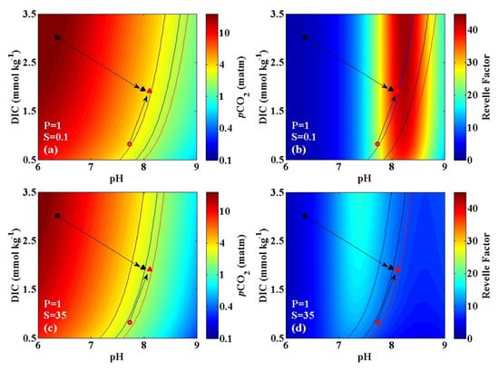 The variation of pCO2 and Revelle factor (RF) under different measurements of pH and DIC. The variation of pCO2 (a) and RF (b) under varied pH and DIC values at waters of salinity 0 and a pressure of 1 atm; pCO2 (c) and RF (d) variations were for waters of salinity 35 and a pressure of 1. The three lines from the right-hand side to the left-hand side represent pCO2 values of 290 (pre-industry CO2 level), 400 (modern CO2 level) and 800 (2100 year CO2 level) µatm, respectively. The change of pCO2 and RF from the river (red circle) to sea (red triangle) mixing process for the Danshuei River estuary can be compared in panel (a) and (c). For the Hoping river-to-sea mixing process, black markers are used. Each arrow represents a general range of mixing process among riverine and oceanic end-members.