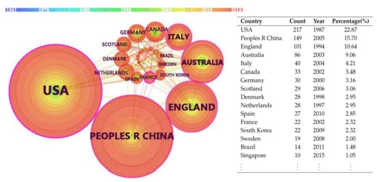 As shown in Figure 3, CiteSpace visualized the research distribution in different countries. The thickness of a ring in each circle is proportional to the number of papers in a given time slice. The colour of each ring represents the publication time corresponding to the time bar on top of the figure. The lines between different circles denotes co-authorship [,]. Although the first Sponge City papers from China is as recent as 2005, China publishes the second most papers, accounting for 15.7% of total studies. The top 4 countries (USA, China, England, Australia) generate almost 60% of Sponge City research, dominating the field in terms of number of publications.