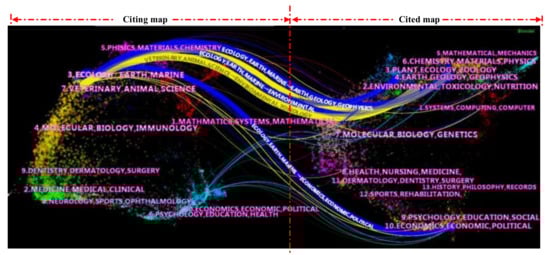 Figure 4 shows a dual-map overlay of the final document storage. The dual-map overlay is designed by Chen and Leydesdorff to reveal patterns of a scientific portfolio with respect to a global map of scientific literature []. The so called “dual-map” refers to the citing and cited relationship in the overall visualization. Given 962 Sponge City papers, CiteSpace visualizes the disciplinary concentrations of these papers, and how these papers connect various regions according to their citation relationship. Each region is depicted by one colour to represent a academic field. Colored curves represent paths of references, originating from the citing map on the left and pointing to the cited map on the right. The nature of each area is determined by a set of journals that belong to the area, that is, a cluster. Each area is labeled by the most-common words in the titles of the corresponding journals. As shown in Figure 4, papers on Sponge City and its synonyms primarily appear in three broad areas on the citing map: the area in the top left corner in dark blue with the label of ecology/earth/marine; the area next to it in yellow with the label of veterinary/animal/science; and the area near the bottom in light blue with the label of economics/economic/political. Citation curves that originated from each of the three major regions point to regions in the cited maps on the right, among which the most primary links in yellow or dark blue are labeled with citing and cited journals. Citation paths in dark blue, for instance, indicate that publications in ecology-, earth-, and marine- related journals cite primarily three groups of journals, including earth/geology/geophisics, environmental/toxiology/nutrition, and economics/economic/political journals [,].