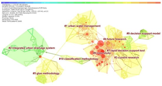 Figure 5 shows the overview of a document co-citation network, reflecting classification of papers based on co-citation relationship. The largest cluster is in the center near the bottom of the figure, i.e., #0 case study. Each node depicts a cited reference. The citation history is visualized in terms of `tree rings’. Nodes with citation bursts, which indicates the possibility that this scientific term has paid or is paying special attention to the potential contribution, are visualized by rings in red []. Similarly, the line between two nodes represents co-citation links [], and the colour of it depicts the citation time corresponding with the time bar above. The largest cluster is #0 case study. The silhouette value of it, which measures the homogeneity of the cluster, is 0.802, close to 1, meaning the high reliability of this result. Case study has been identified with assistance in the problem of urban water management. It is available for scholars to do research basing on practical case and propose certain recommendations. Governments and communities are also capable of studying previous cases of practices, summarising their experiences, then selecting and utilising a set of appropriate plans. The second largest cluster is #1 urban water management, with a silhouette number of 0.942. It primarily concerns over public wastewater disposal and water supply management []. According to Citespace, the primary thermal investigation of this cluster are lowland area, non-point pollutant runoff, urban flood vulnerability, bioretention swale, mandatory urban rainwater harvesting, fossil energy, landscape fragmentation analysis, water recycling technologies and GIS water management system. The third largest cluster #2 integrated urban drainage system (IUDS), which has been referred in the introduction, is an conception of integration of sewer, sewage water treatment plant, water receiving systems, and sustainable stormwater management, with economic factors taken into consideration [].