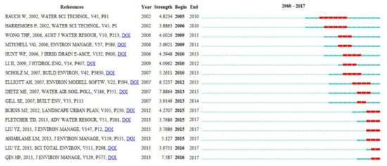 The first strongest citation burst began in year 2005 was written by Hauger et al. in 2002 []. It presented and discussed a probabilistic approach to evaluating the performance of urban wastewater systems. The second strongest citation burst is also published in 2002 from Harremoes [], which mainly summarized the status of urban storm drainage as an integrated professional discipline. The third paper presented an overview of current state of practising WSUD in Australia []. The fourth article was written by Scholz et al. It made a review about the wide-range literature on permeable pavement systems, summarised the research trend and put forward some recommendations for future study []. Next paper, written by Elliott et al. in 2007 focused on the low impact urban stormwater drainage technology and made a review of the LID models []. The sixth article, published in 2007, also belongs to review of LID practices, made a summary of temporary research, such as bioretention cells, porous pavement and grassed swales []. It has been cited 424 times in total, which represents the strongest citation burst among all the articles in the dataset. Ahiablame et al. [] also made contributions on LID technology and assessed the performance of rain barrel/cistern and porous pavement []. The last paper in the list is from Qin et al. [], which focused on LID and its effects on urban flooding under different rainfall characteristics. It can be figured out through examining the strongest citation burst that advanced technologies of LID practices has been paid the closest attention, followed by urban stormwater drainage, permeable pavement and urban flooding.