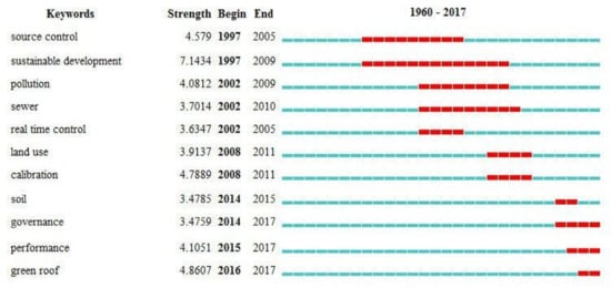 Similar to the citation bursts, keywords burst detection is also available of depicting bursts keywords to indicating research foci. The time periods of bursts are depicted as blocks in red. As shown in Figure 7, top 11 strongest keywords bursts present during the period between 1960 to 2018. The strongest burst among ones began in the same year include source control (started in 1997), sustainable development (started in 1997), pollution (started in 2002), sewer (started in 2002), real time control (started in 2002), land use (started in 2008), calibration (started in 2008), soil (started in 2014), governance (started in 2014), performance (started in 2015), and green-roof (started in 2016). These results are close to the trend figured from Figure 8.