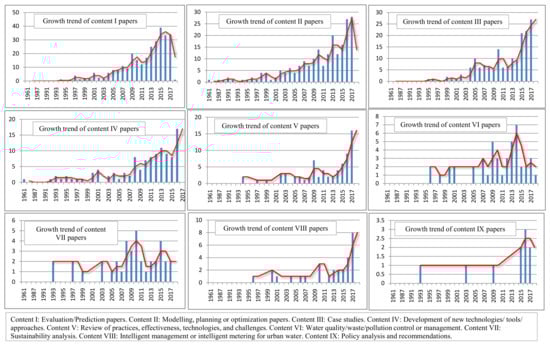 (3) Application of information technology. The promise of collecting and utilizing large amounts of data has never been greater in the history of urban water management [,]. It is very challenging that Sponge City needs to gather and monitor data in real time which allows mining these data for details that aid in day-to-day operations, regulatory compliance, and cost savings. Big amounts of data are generated and exchanged between departments, devices and regions. Some of the data exchanged are highly uncertain [,,,]. A typical case study is from Thorndahl et al. [], who tried to simulate various types of flood events both historically and in real-time. The system of [] was tested on the small town of Lystrup in Denmark. Results show it was possible to generate detailed flood maps in real-time with high resolution radar rainfall data, but rather limited forecast performance in predicting floods with leadtimes more than half an hour. Many papers pointed out that information technology has become a requisite part of municipal water management systems [,,,]. Many Content I, II, IV, VI, VIII papers are data-driven studies, such as application of weather radar data [,], urban data integration planning or database [,], urban storm water data processing [], assessment of data and parameter uncertainties [,,,]. Some outstanding keywords in Figure 8 represent the focus of information technology, such as “real time control”, “simulation”, “uncertainty”. As it is shown in Figure 7, “real-time control” is one of the keywords with the strongest citation bursts. It can be noticed that the growth trend in content VIII “intelligent management or intelligent metering for urban water” is remarkable as shown in Figure 9. It is also a proof of information technology and intelligent management becoming focus of frontier Sponge City research.