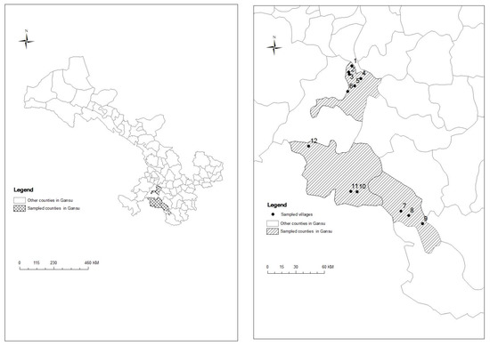 The data analyzed in this study comprise survey data collected by the Environmental Economics Program in China (EEPC) at Peking University. The EEPC members surveyed 120 households in 12 villages in Gannan Tibetan Autonomous Region in Gansu province, collecting information in both 1997 and 2012. Equal numbers of villages on both sides of Qinling Ridge were randomly selected, as shown in Figure 2. Within each village, 10 households were randomly selected for interview in person. One household out of the 120 surveyed households has a serious data-missing problem, so we drop it from the data analysis. The sample for data analysis is 119 households in total. Information collected in interviews included: (1) individual characteristics, including age, gender, ethnicity, education, whether on the labor market, type of labor, etc.; (2) characteristics of households, including number of household members, number of children, etc.; and (3) information on land, including total land area, area enrolled in Grain for Green, quality of land, distances of land from residence and road, etc. Information on land characteristics are collected for each plot held by the surveyed household. Since the sampled area is a Tibetan autonomous region, the minority Zang (Tibetan) and the majority Han dominate. Therefore, in our sample, most of the minority individuals are from the Zang minority. We have 67 Han households, and 52 minority households. The 52 minority households include 51 Zang households and one minority Tu household. In this paper, we include the Tu minority in the analysis, for being representative of the ethnicity distribution of this area. We reran the summary statistics and the main regressions using the sample excluding the Tu household, and found that the results remained stable.
