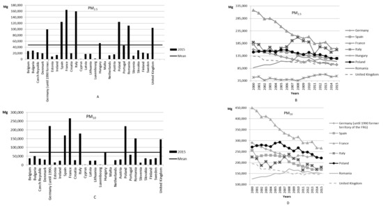 - Germany, Spain, France, Italy, Poland, Romania, United Kingdom—total PM10 emissions of these countries account for about 70% of total EU emissions (except for Greece—no data) (Figure 1C)