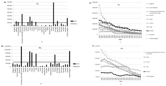 The level of emission of gas pollutants in the European Union (A,C,E,G) in 2015 (B,D,F,H) for the largest issuers over the years (based on Eurostat data).